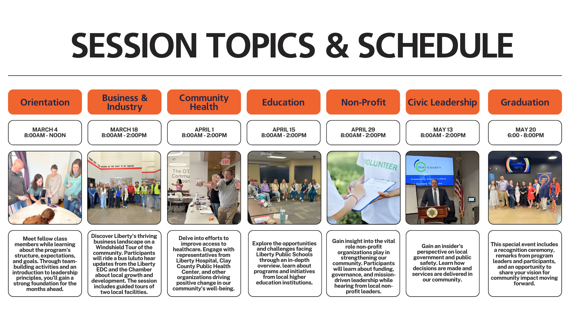 Leadership Liberty, presented by the Liberty Chamber, is an immersive program designed to develop both leadership skills and community knowledge. Over three months, participants will gain a deep understanding of Liberty’s unique challenges and opportunities, develop vital leadership competencies, and explore avenues for meaningful community engagement.