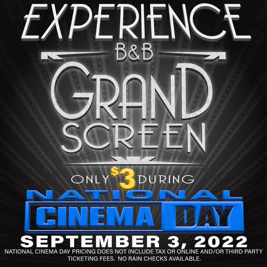 NATIONAL CINEMA DAY is coming to B&B Theatres Sept 3!!! Experience the Magic of the Movies on the #GRANDSCREEN for only $ 3 during Cinema Day!!! Snag your tickets early before their gone! https://www.bbtheatres.com/showtimes/Images