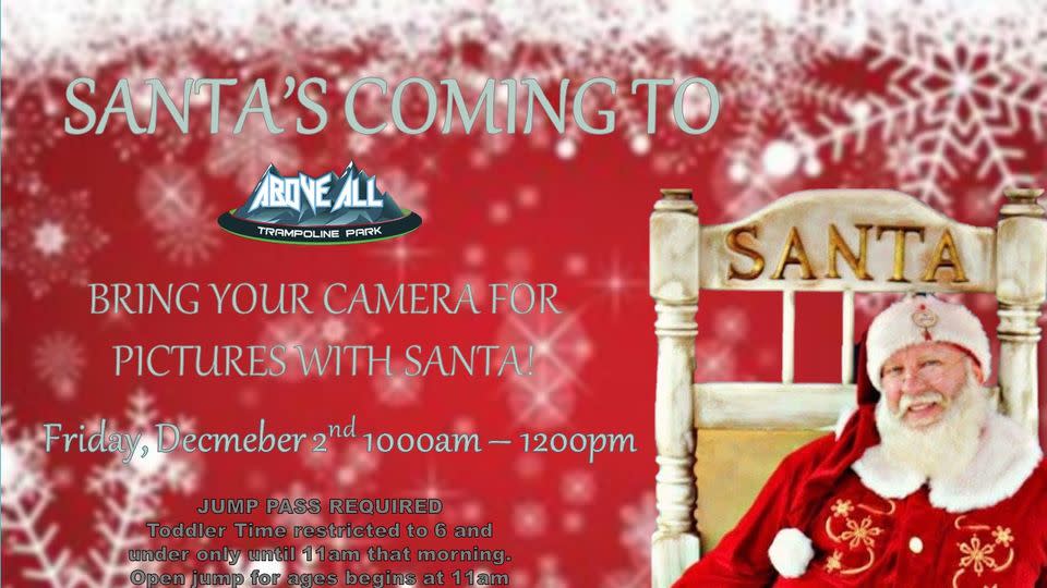 Bring your cameras for pictures with Santa at Above All Trampoline Park on Friday, December 2 during Toddler Time. PartiesImages